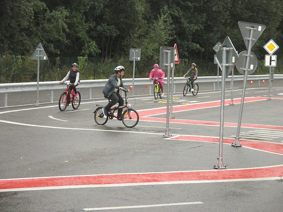 V první části se žáci seznámili s teorií, kde si zopakovali dopravní značky a předpisy, které je nutné dodržovat v silničním provozu. Následovala praktická část, tu si všichni velmi užili. Nejprve bylo třeba seřídit sedla na vypůjčených kolech, nasadit si helmy. A mohlo se vyrazit. Děti si na hřišti vyzkoušely průjezd kruhovým objezdem a různými druhy křižovatek, zastavení na červenou či před železničním přejezdem. Na hřišti bylo velice důležité udržet pozornost a dokázat sledovat všechny dopravní značky, aby nedošlo ke kolizi. Někteří žáci také na chvíli odložili kola a vyzkoušeli si roli chodců. Jen výjimečně některé děti přemohla touha porušit nějaký dopravní předpis a projet křižovatkou na červenou nebo nezastavit na „stopce“. Žádná nehoda se však nestala. Trénink jízdy na kole v simulovaném silničním provozu byl pro všechny přínosný. I přes lehký déšť, který nás zastihl, se všichni velmi snažili a nenechali se nepřízní počasí odradit. Lucie Šulcová