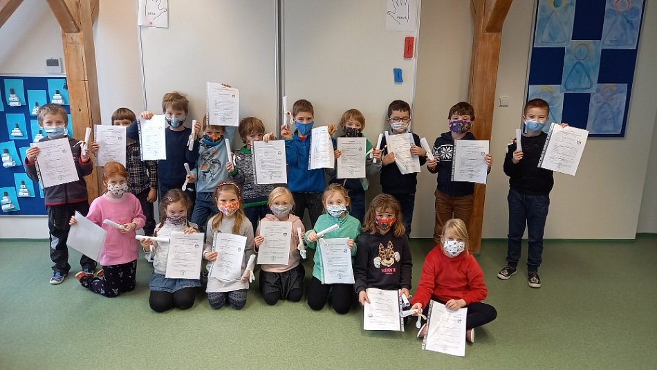 Jsme velmi rádi, že máme tu možnost, učit se ve škole. Práce máme stále dost, ale jsme šikovní a ,,makáme" na plné obrátky. V českém jazyce se doslova válíme v písmenkách. Při hodinách matematiky nás moc baví "matematická koulovačka". Nejlepší je, když můžeme pořádně zkoulovat paní učitelku. Psaní číslice 8 jsme trénovali i v hodině výtvarné výchovy a odměnou nám byli krásní tučňáci. O přestávkách se občas konají sáňkařské závody s vlastnoručně vyrobenými závodníky. A konec měsíce byl ve znamení vydávání našeho prvního vysvědčení.